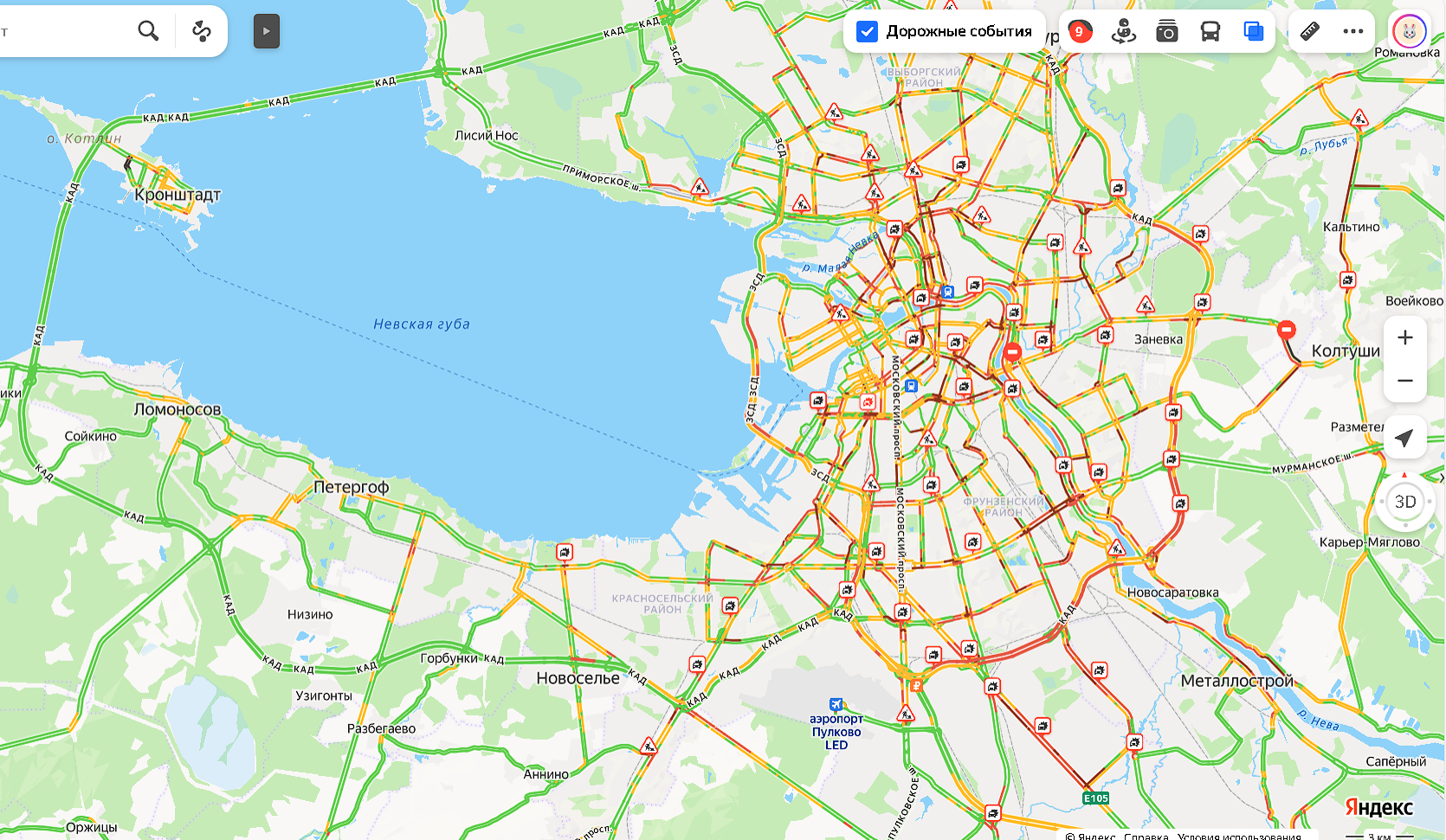 Самый длинный затор образовался на южном и юго-восточном секторах Кольцевой автодороги, протянувшись более чем на 10 километров в обе стороны. Серьёзные затруднения также возникли на Западном скоростном диаметре. Наиболее проблемными участками стали Васильевский остров, район проспекта Стачек и южная развязка с КАД. Большая часть магистралей на карте была помечена жёлтым цветом, указывая на медленное движение.