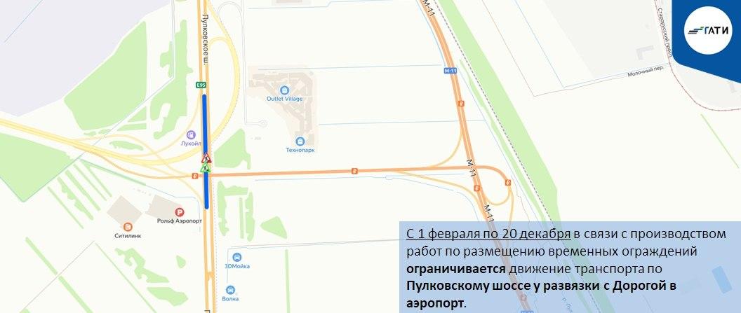 С 1 февраля по 20 декабря движение по Пулковскому шоссе будет ограничено у развязки с Дорогой в аэропорт из-за установки временных ограждений.