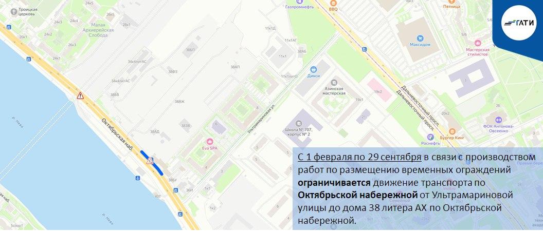С 1 февраля по 29 сентября на Октябрьской набережной от Ультрамариновой улицы до дома 38, литера АХ, введут ограничения движения из-за временных ограждений.