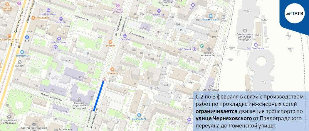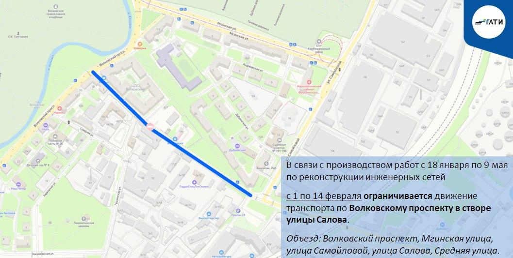 Параллельно, с 1 по 14 февраля, для реконструкции инженерных сетей ограничат проезд по Волковскому проспекту в створе улицы Салова. Объезд возможен по Волковскому проспекту, Мгинской улице, улице Самойловой, улице Салова и Средней улице.