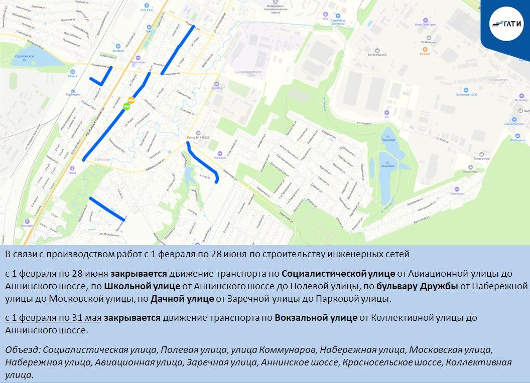 - до 31 мая — по Вокзальной улице от Коллективной улицы до Аннинского шоссе.