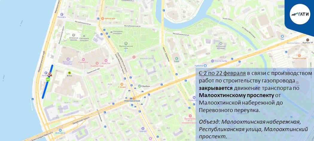 Для строительства газопровода с 2 по 22 февраля будет полностью перекрыто движение по Малоохтинскому проспекту от Малоохтинской набережной до Перевозного переулка. Объезд организован по Малоохтинской набережной, Республиканской улице и Малоохтинскому проспекту.
