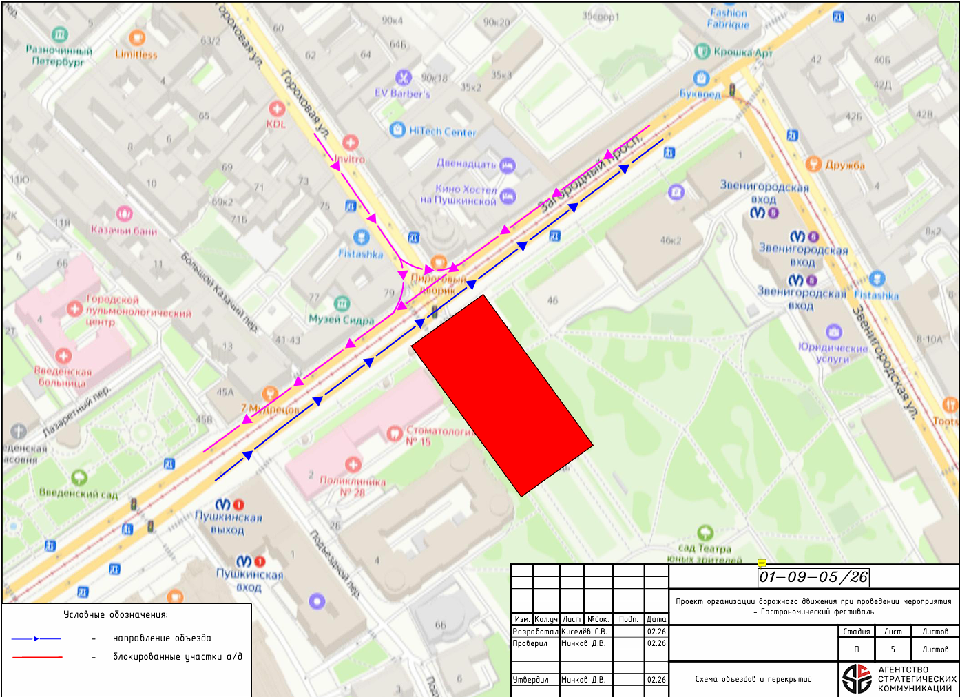 С 7 по 14 мая из-за Гастрономического фестиваля будут действовать ограничения на Загородном проспекте у Пионерской площади. Стоянку запретят с 00:00 до 23:59 7 мая и с 00:00 13 мая до 23:59 14 мая. Движение транспорта перекроют с 00:00 8 мая до 23:59 12 мая.