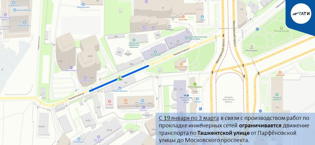 На Ташкентской улице от Парфёновской улицы до Московского проспекта с 19 января по 3 марта движение ограничено из-за прокладки инженерных сетей.