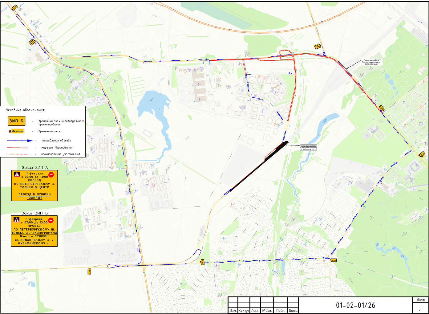 По информации комитета по транспорту Петербурга, опубликованной 29 января, для обеспечения безопасности участников с 07:00 до 13:00 будет сужена проезжая часть Пулковского шоссе вдоль дома 411 в направлении Петербургского шоссе. На этот же период полностью перекроют движение на следующих участках дорог: