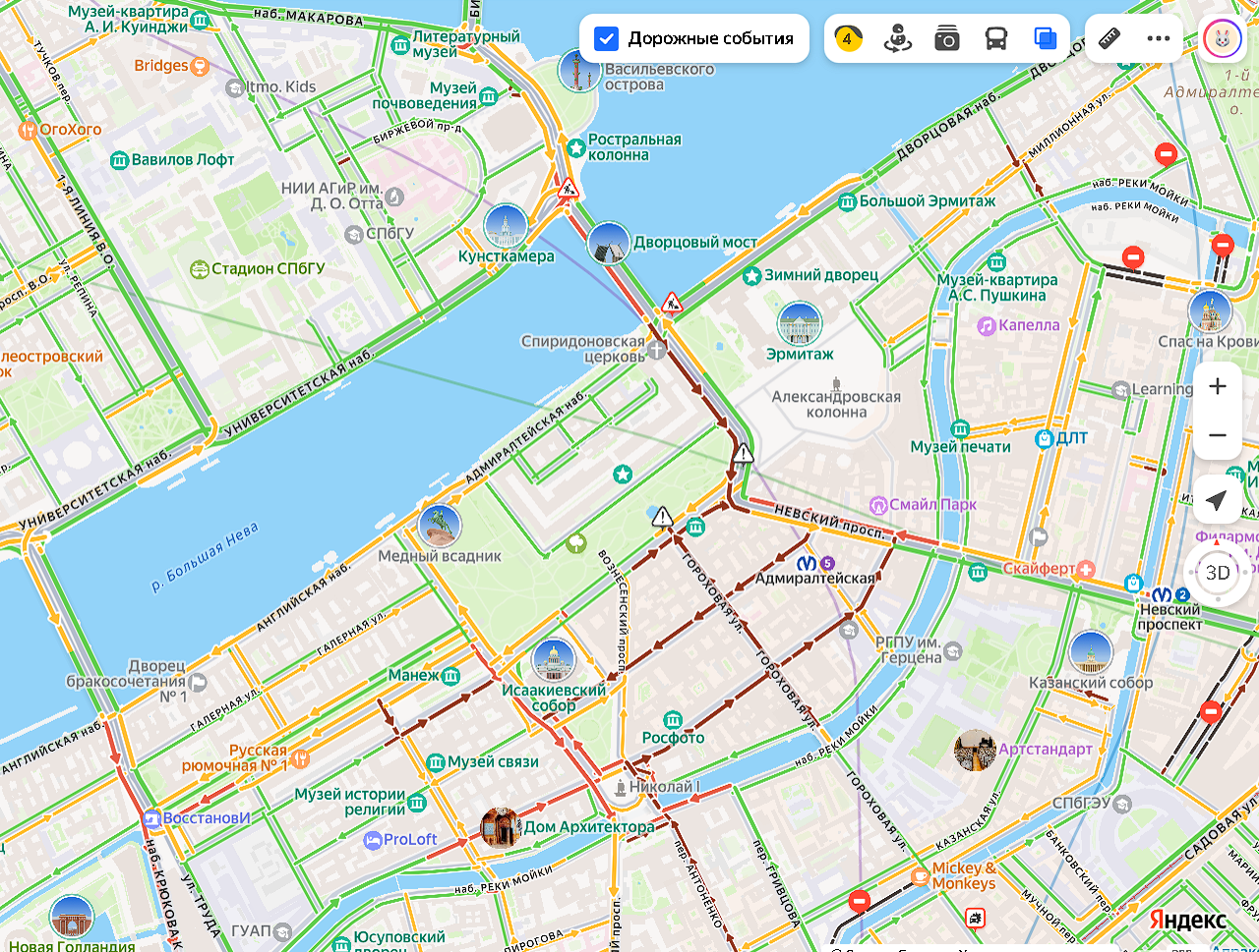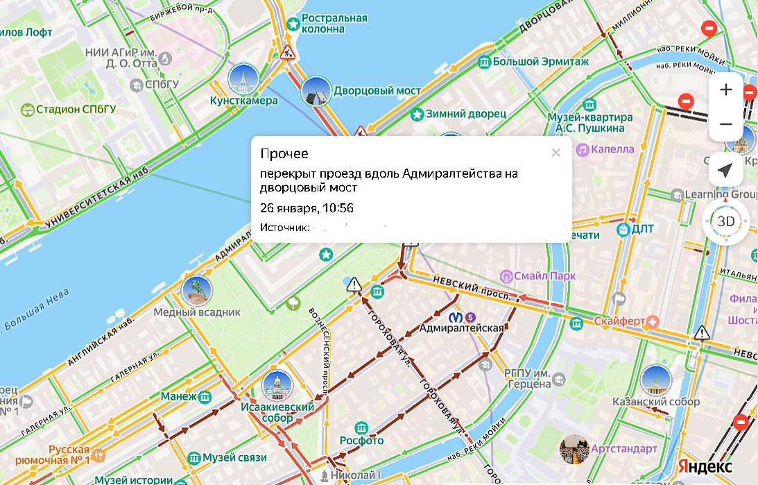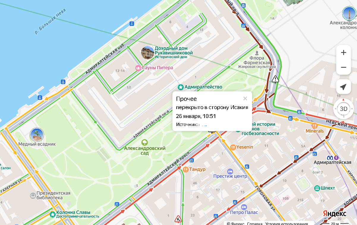 По сообщениям автомобилистов, перекрыт проезд вдоль Адмиралтейства к Дворцовому мосту, а также на подъездных путях к Исаакиевскому собору.