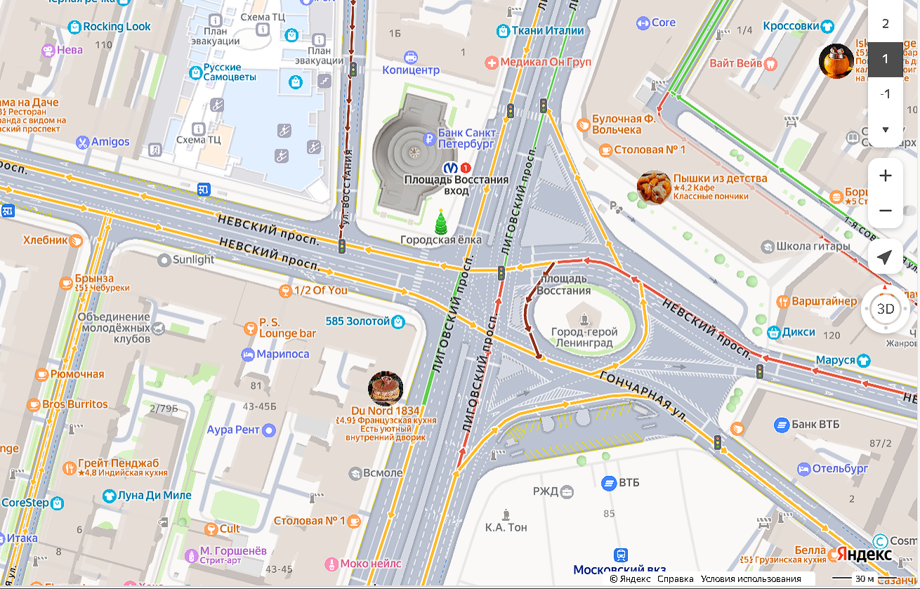 Перекрёсток Невского и Лиговского проспектов на площади Восстания считается одним из самых загруженных в Санкт-Петербурге, с интенсивным движением транспорта и пешеходов.