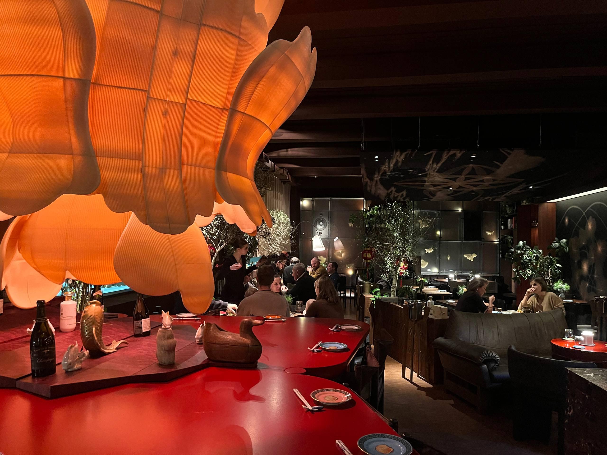 Меню сочетает китайские и японские блюда, включая раздел Raw bar с морепродуктами. Цены здесь высокие: