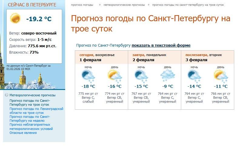 Днём воздух прогреется до -14…-16 градусов, в Ленинградской области — до -13…-18, а в отдельных районах до -23. Ветер северо-восточный со скоростью 3-87 м/с. Атмосферное давление продолжит снижаться и составит 771 мм рт. ст., что превышает нормальные значения.