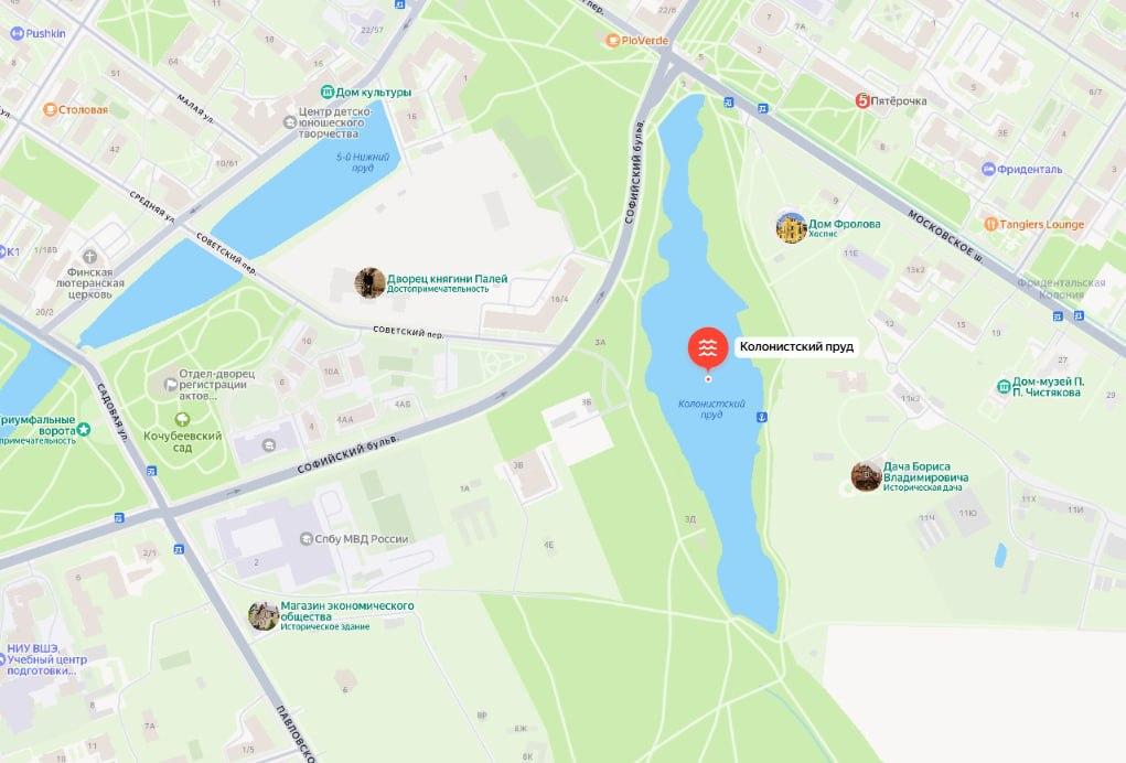 Колонистский пруд расположен в Пушкине, на территории Отдельного парка