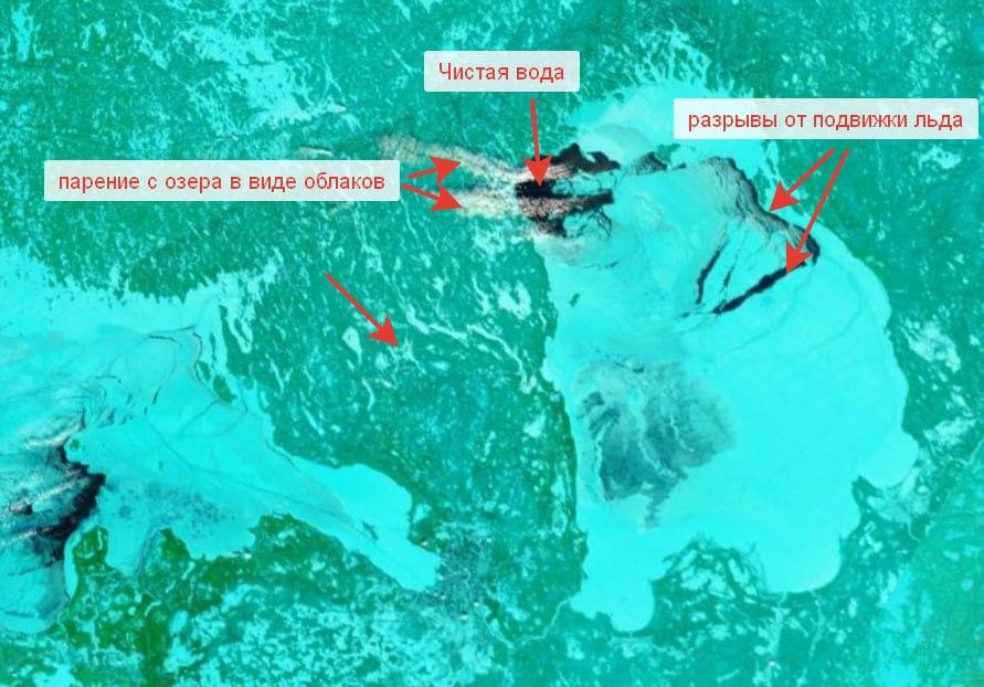 На фотографии со спутника чётко видны ключевые детали. «Всё можно рассмотреть: и оставшуюся незамерзшей небольшую часть озера на северо-западе акватории, и парение в виде облаков с этой открытой части, и подвижки льда в виде трещин под действием восточного ветра», — пояснил синоптик.