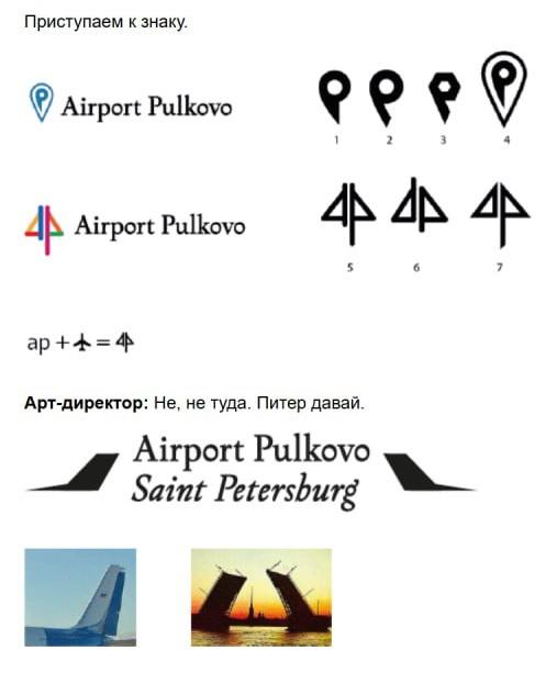 Студия Лебедева отличается открытостью: при первой разработке логотипа для «Пулково» на сайте опубликовали не только семантическую справку, но и упрощённое описание творческого процесса. Начинается оно с диалога: