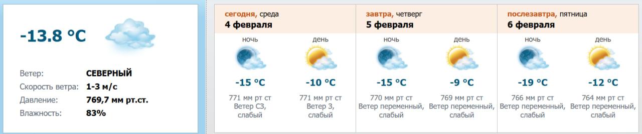 В ближайшие дни морозы усилятся. В ночь на 5 февраля температура опустится до -14… -16 градусов, местами до -20. Днем 5 февраля будет -8… -10. 6 февраля ночью прогнозируется -18… -20, в отдельных районах до -24, днем — -11… -13. Осадков не ожидается.