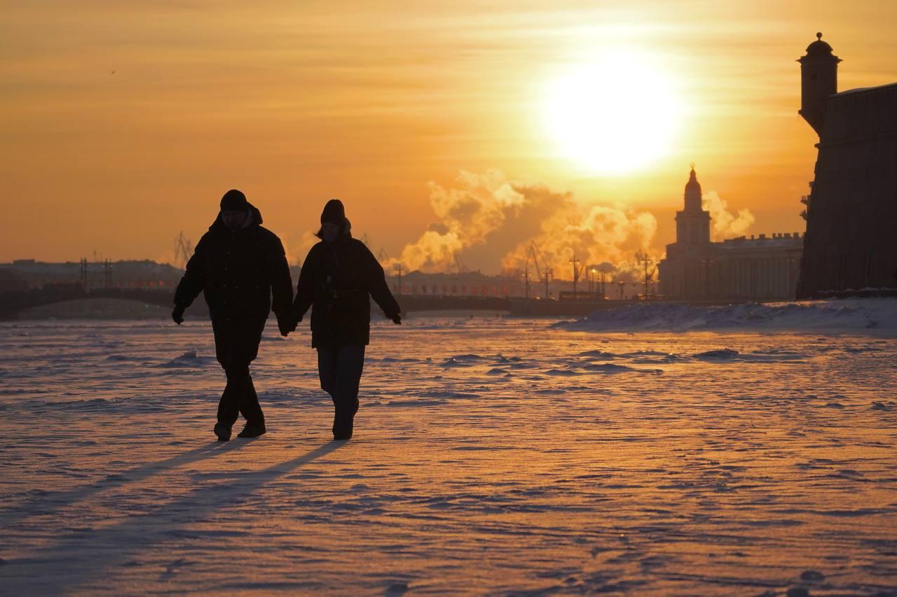 В морозный воскресный день жители Санкт-Петербурга отправились на прогулку по льду Невы и городских каналов, несмотря на действующие ограничения.