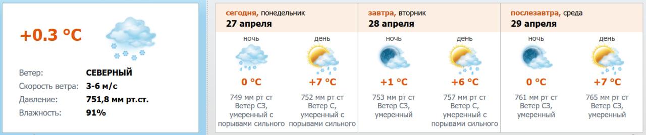 Хотя до лета остаётся около месяца, последняя неделя апреля в обоих столицах — Петербурге и Москве — началась со снегопада. По данным ФГБУ «Северо-Западное управление по гидрометеорологии и мониторингу окружающей среды», 27-го числа в Северной столице ожидается облачная погода с прояснениями, местами пройдёт мокрый снег с дождём. Ветер северо-западный и северный, умеренный, возможны сильные порывы.