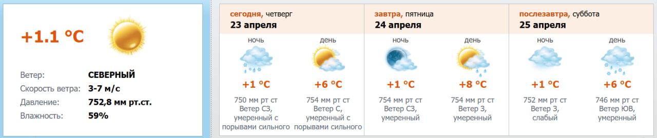 Согласно данным Северо-Западного управления по гидрометеорологии, 23 апреля в Санкт-Петербурге будет переменная облачность, днём существенных осадков не прогнозируется. Ветер ожидается северо-западного и северного направлений, умеренной силы, с порывами до сильных. Температура днём поднимется до +5…+7 градусов. Атмосферное давление ночью повысится, а в течение дня останется стабильным.