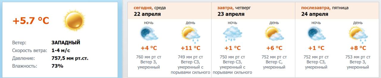Уже завтра, 23 апреля, прогнозируется резкое похолодание. Ночью температура опустится до 0…+2 градусов, пройдут осадки в виде дождя и мокрого снега, ветер станет порывистым. Днём потеплеет до +5…+7 градусов, существенных осадков не ожидается. В пятницу, 24 апреля, ночью будет 0…+2 градуса без осадков, днём воздух прогреется до +7…+9, местами возможны небольшие осадки, преимущественно в виде дождя.