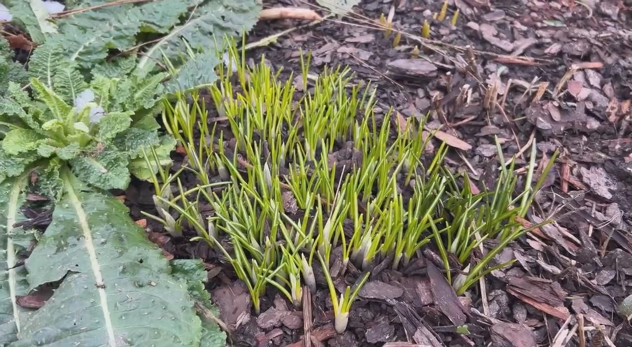 Уже заметны и первые ростки гиацинтов, которые только начинают пробиваться из земли. Более густые группы образовали крокусы: их уже видно в виде щёточек, и ожидается, что они зацветут через две-три недели, добавив красок в общую картину.