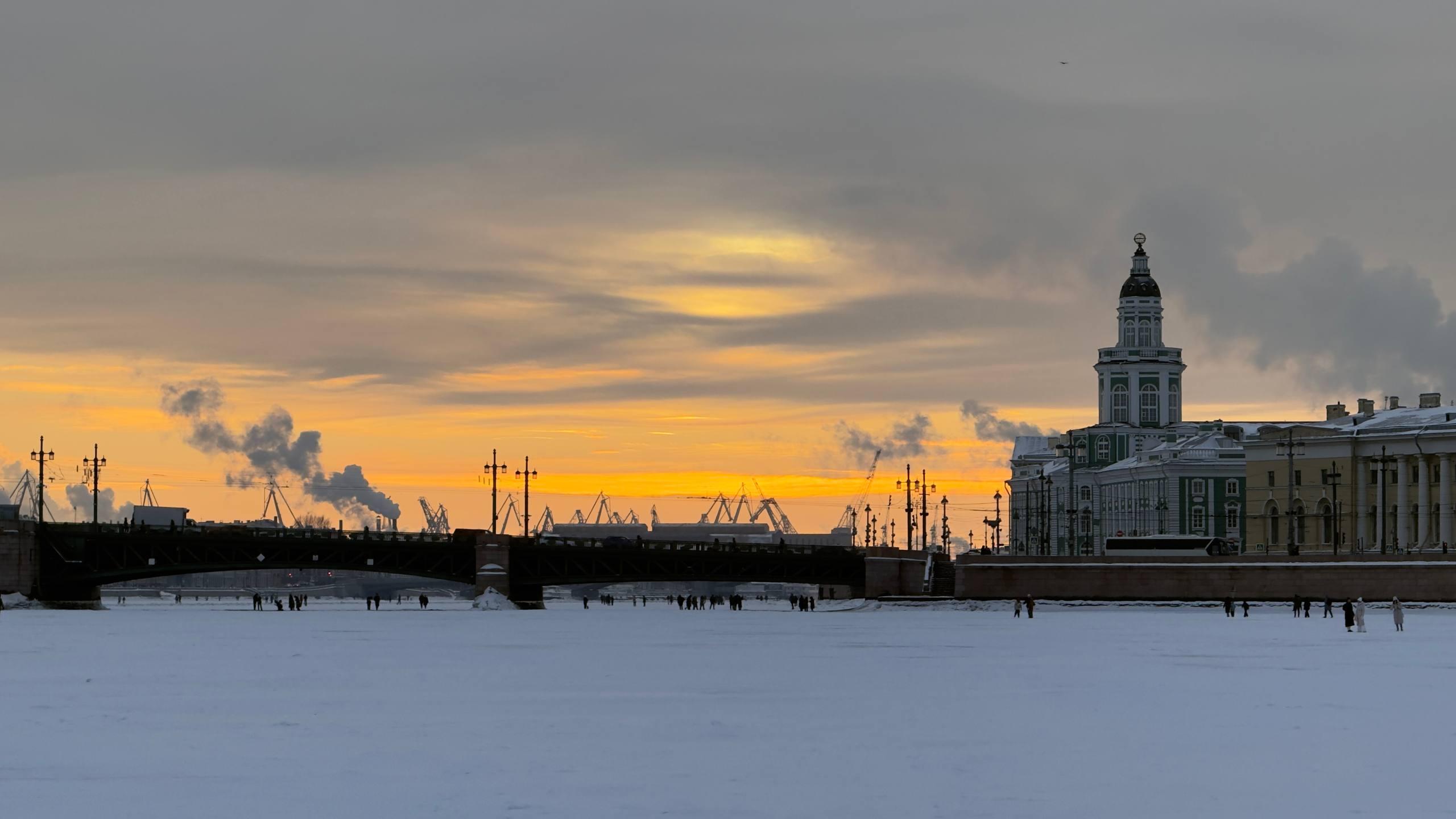 Вечером 7 февраля десятки человек вышли на лед Невы в центре Санкт-Петербурга, чтобы полюбоваться закатом, игнорируя запрет властей.