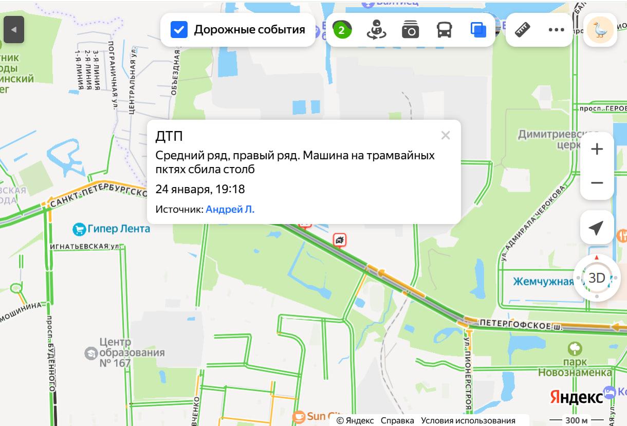Вечером 24 января дорожно-транспортное происшествие на Петергофском шоссе в районе Новосергиево привело к временной остановке трамвайного движения.