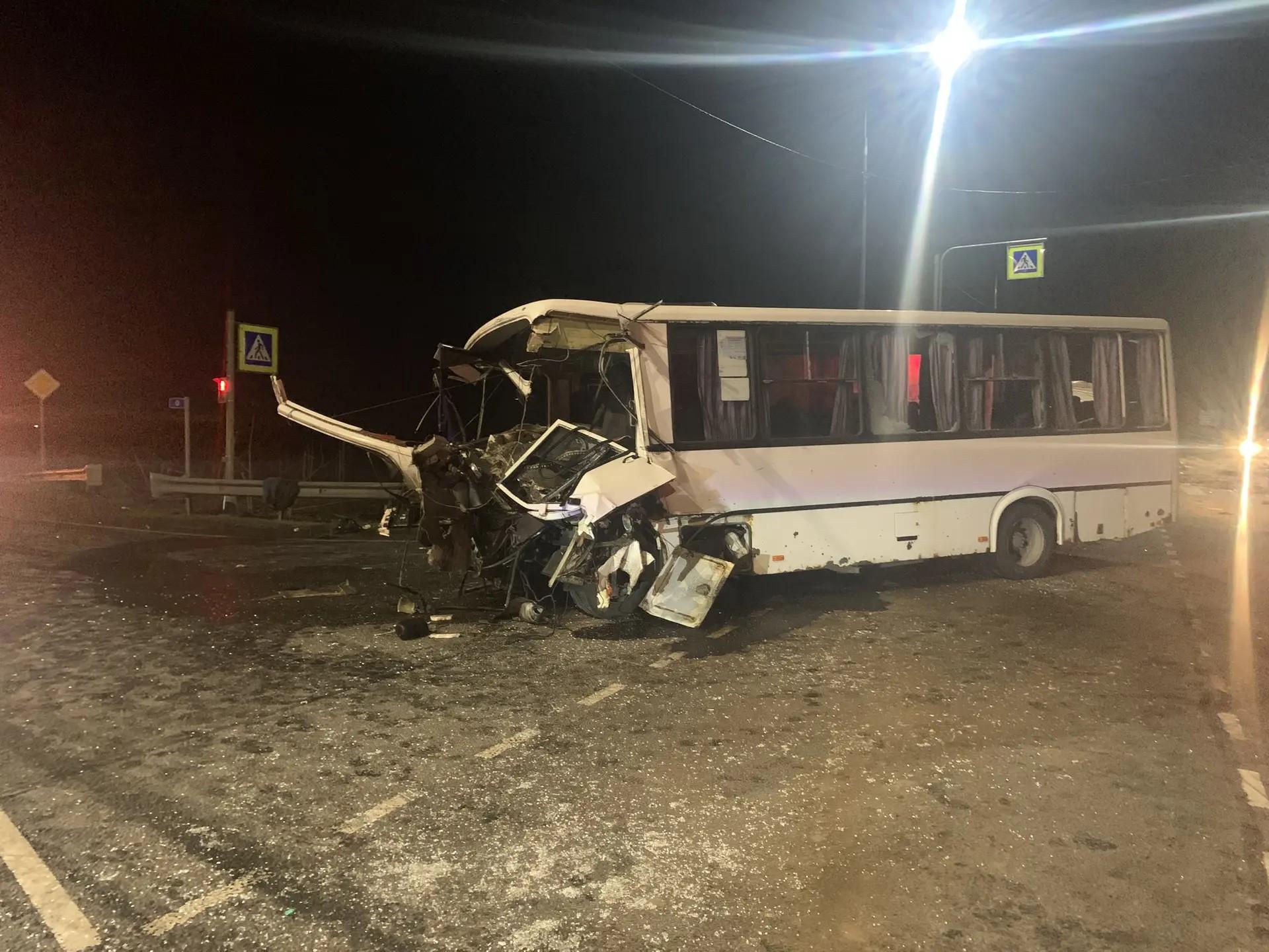 ДТП случилось около 20:00 24 апреля на 41-м километре трассы А-120. По информации ГУ МВД по Петербургу и Ленобласти, водитель автопоезда выехал на регулируемый перекрёсток на запрещающий сигнал светофора и врезался в рейсовый ПАЗ. От удара передняя часть автобуса была полностью разрушена, грузовик также получил серьёзные повреждения.