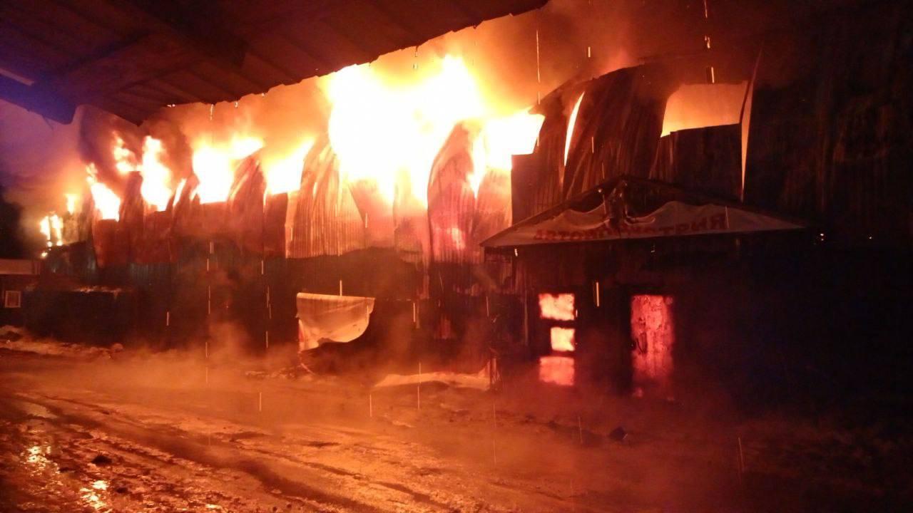 Вечером 18 января в поселке имени Свердлова вспыхнул пожар на площади тысяча квадратных метров. Здание с автосервисом и складом запчастей было полностью охвачено огнем.