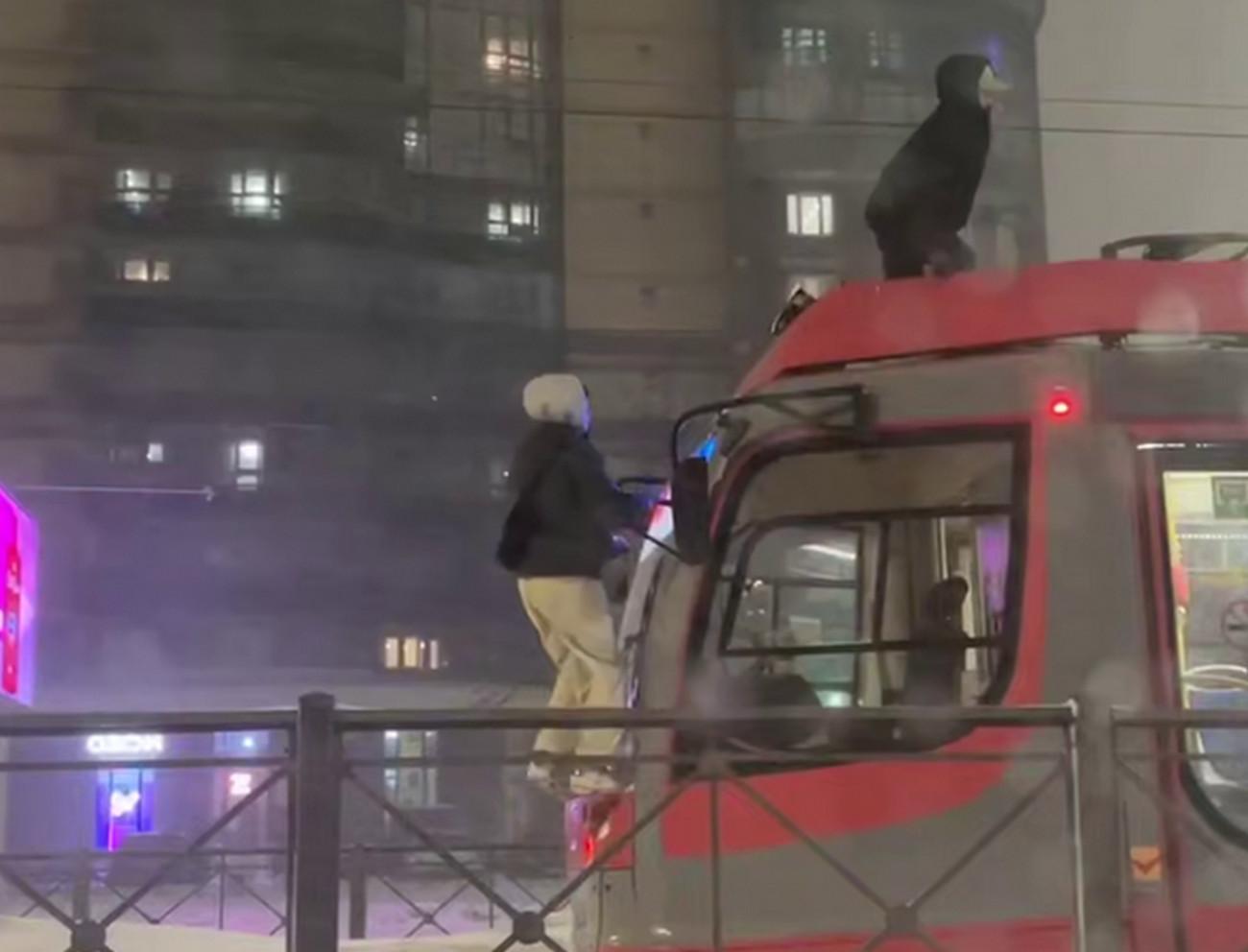 Двое молодых людей устроили опасную поездку на крыше трамвая во время метели в Санкт-Петербурге. Видео с инцидентом направлено в правоохранительные органы для разбирательства.