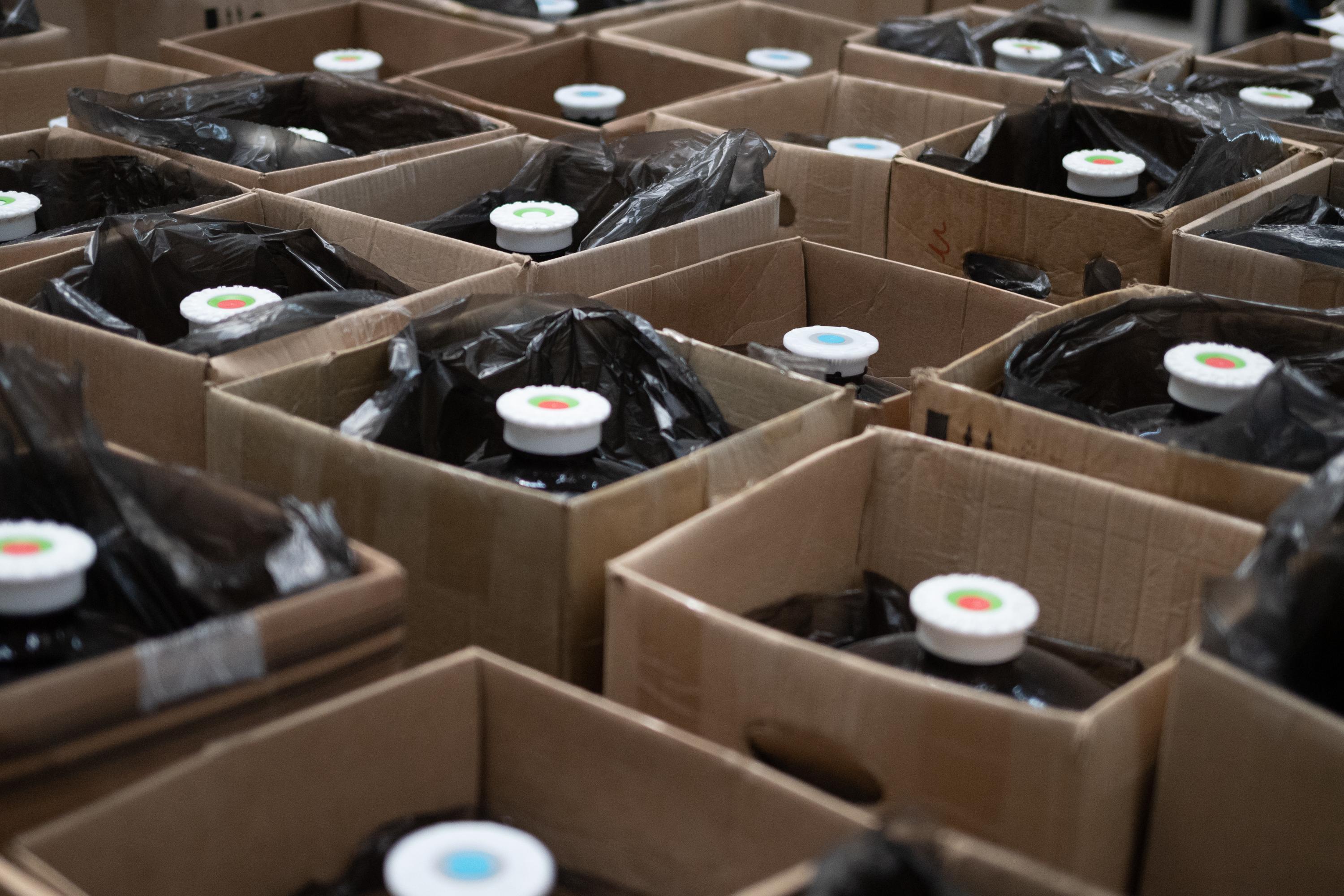 В подсобных помещениях нашли кустарные линии розлива, около 1,3 тысячи литров спиртосодержащей жидкости с этикетками известных брендов, а также оборудование для фальсификации: еврокубы, насосы, шланги и упаковку.