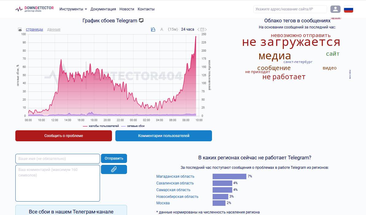 Сервис отслеживания доступности Downdetector сообщил о серьезных перебоях в работе Telegram на территории России 10 февраля.