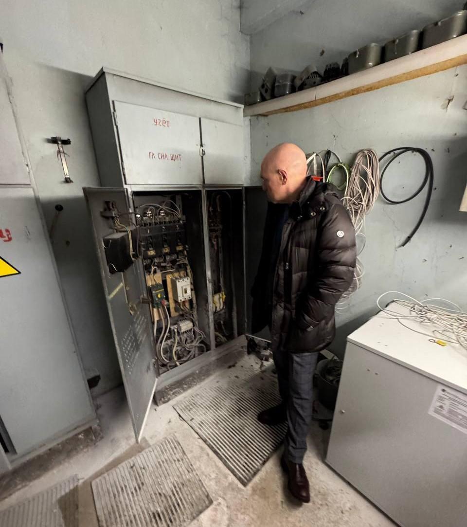 Глава администрации Фрунзенского района Константин Серов осматривает электрощиток, где произошло короткое замыкание.