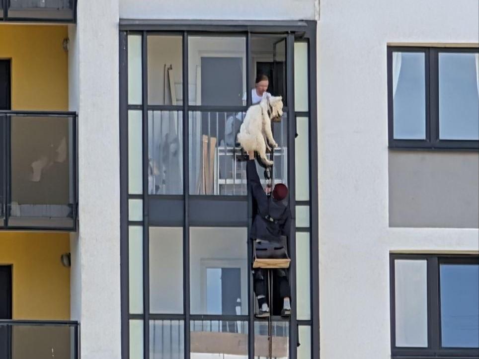 Около трёх часов дня промышленный альпинист поднялся на уровень седьмого этажа, извлёк животное и переправил его на этаж выше, где пса временно разместили у соседей.