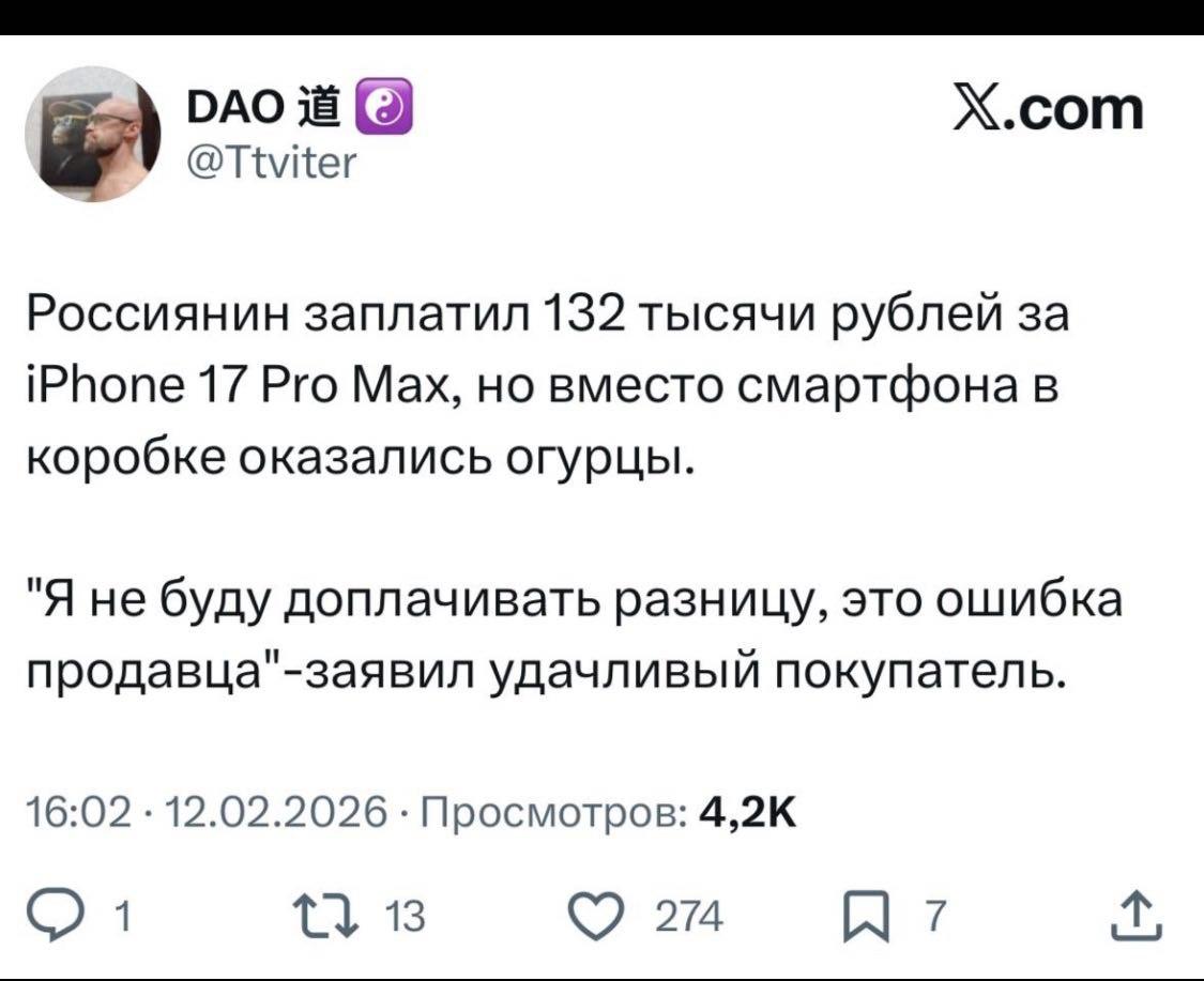 - Пользователь социальной сети X опубликовал шутку про обманутого покупателя, который нашёл в коробке от смартфона огурцы.