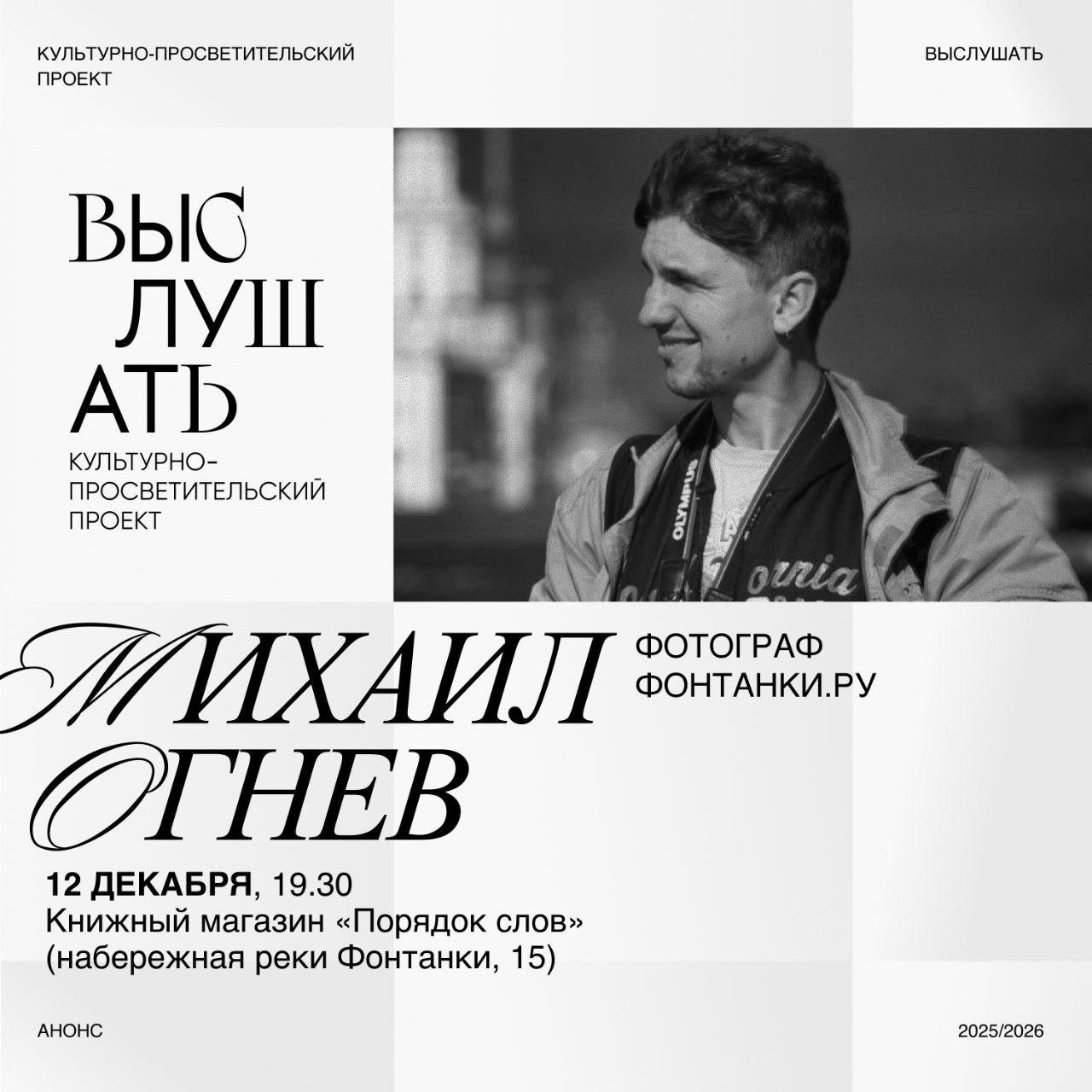 Фотограф издания «Фонтанка» Михаил Огнев станет гостем культурного проекта «Выслушать». Встреча состоится 12 декабря в книжном магазине «Порядок слов».