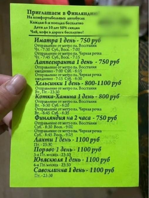 В интернете распространяется фотография рекламной листовки из прошлого. На ней предлагалось отправиться на автобусе из центра Петербурга в Финляндию — объявление датируется концом нулевых или началом десятых годов.