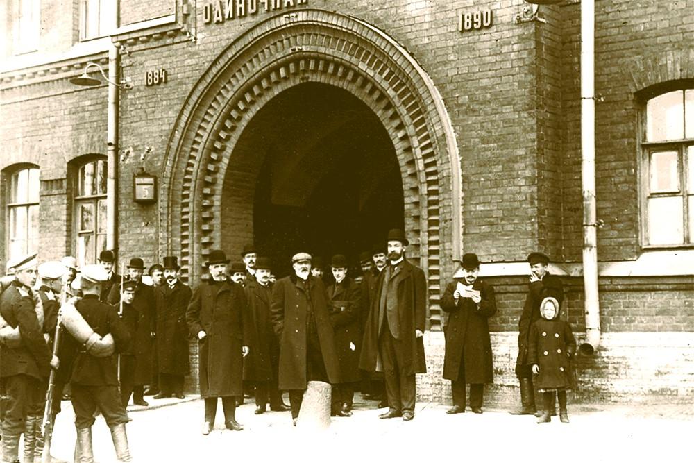 Группа депутатов, осужденных за подписание Выборгского воззвания, у ворот тюрьмы «Кресты»