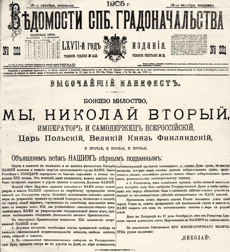 Всё началось с Манифеста 17 октября 1905 года, даровавшего политические свободы и законодательные полномочия Думе. Реакция на манифест была неоднозначной: будущий большевик Павел Арский (Афанасьев) сочинил в полтавской тюрьме стихи: «Царь испугался, издал манифест: мертвым свободу, живых под арест». Сам Николай II в письме матери признавался, что переживал тяжелые дни.