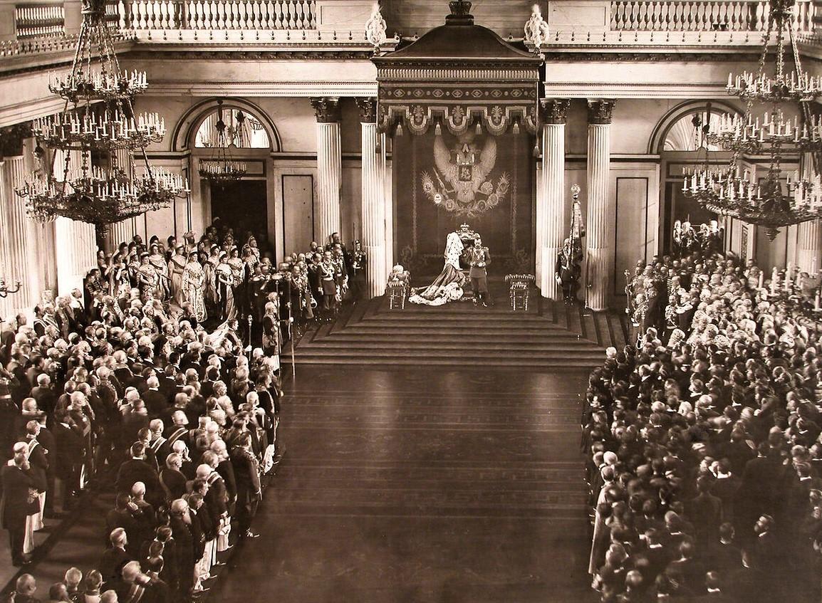 Император Николай II читает приветственное слово в Георгиевском зале Зимнего дворца