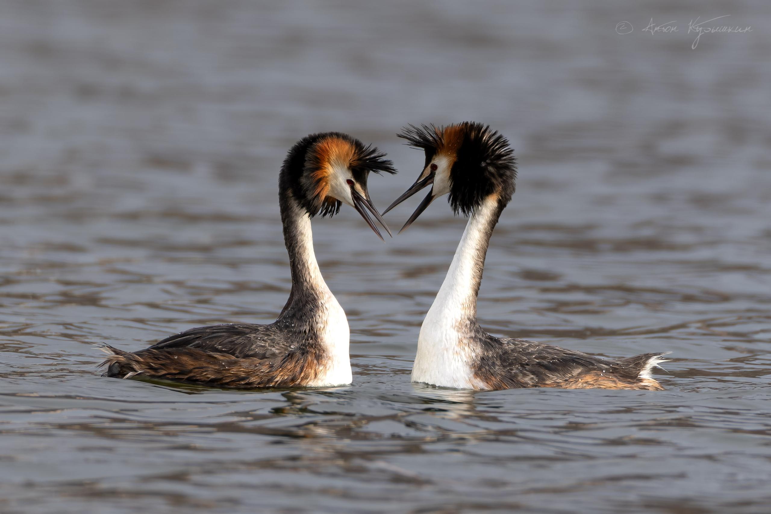На озере Долгом и других водоемах большие поганки, или чомги, исполняют брачные танцы.