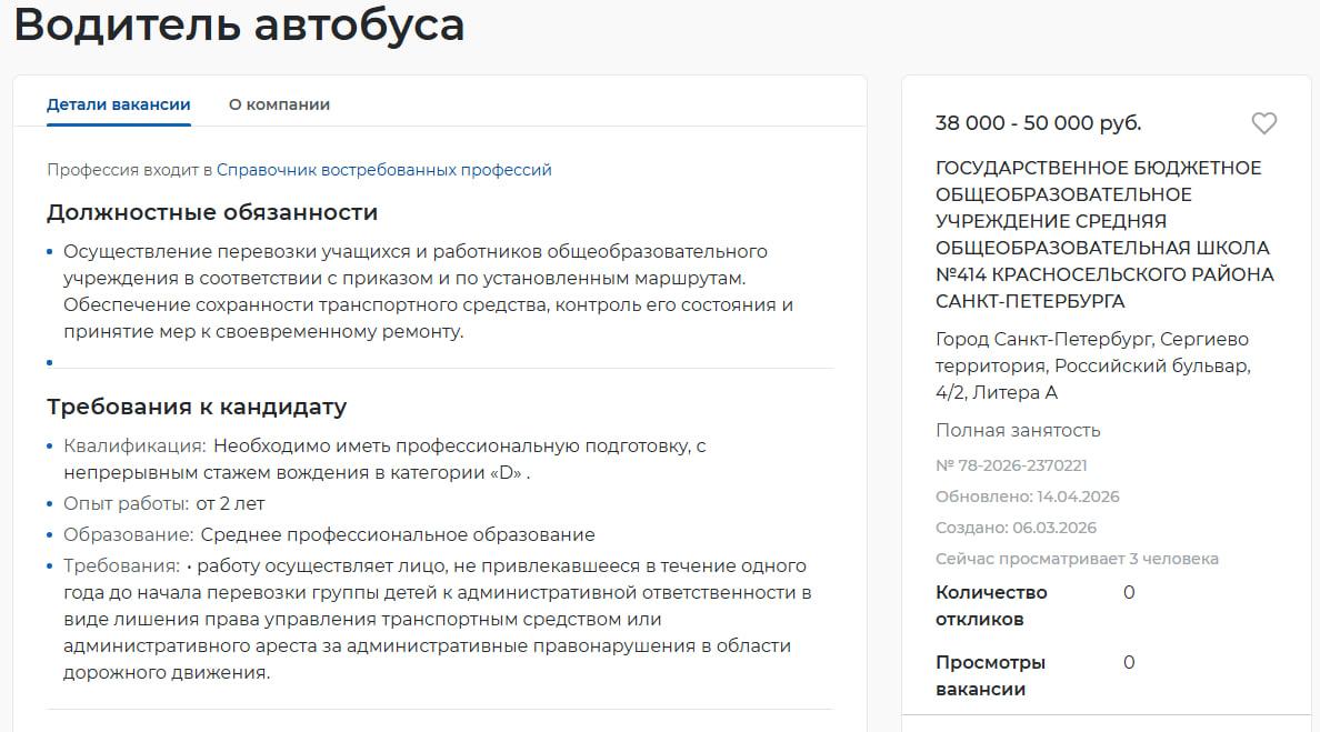 На портале «Работа России» была найдена вакансия водителя для школы № 16 с зарплатой 40-50 тысяч рублей. От соискателя требуют не менее 10 лет опыта и права категории D. Директор Мария Терновская сообщила, что с 8 апреля водитель оформляется на работу.