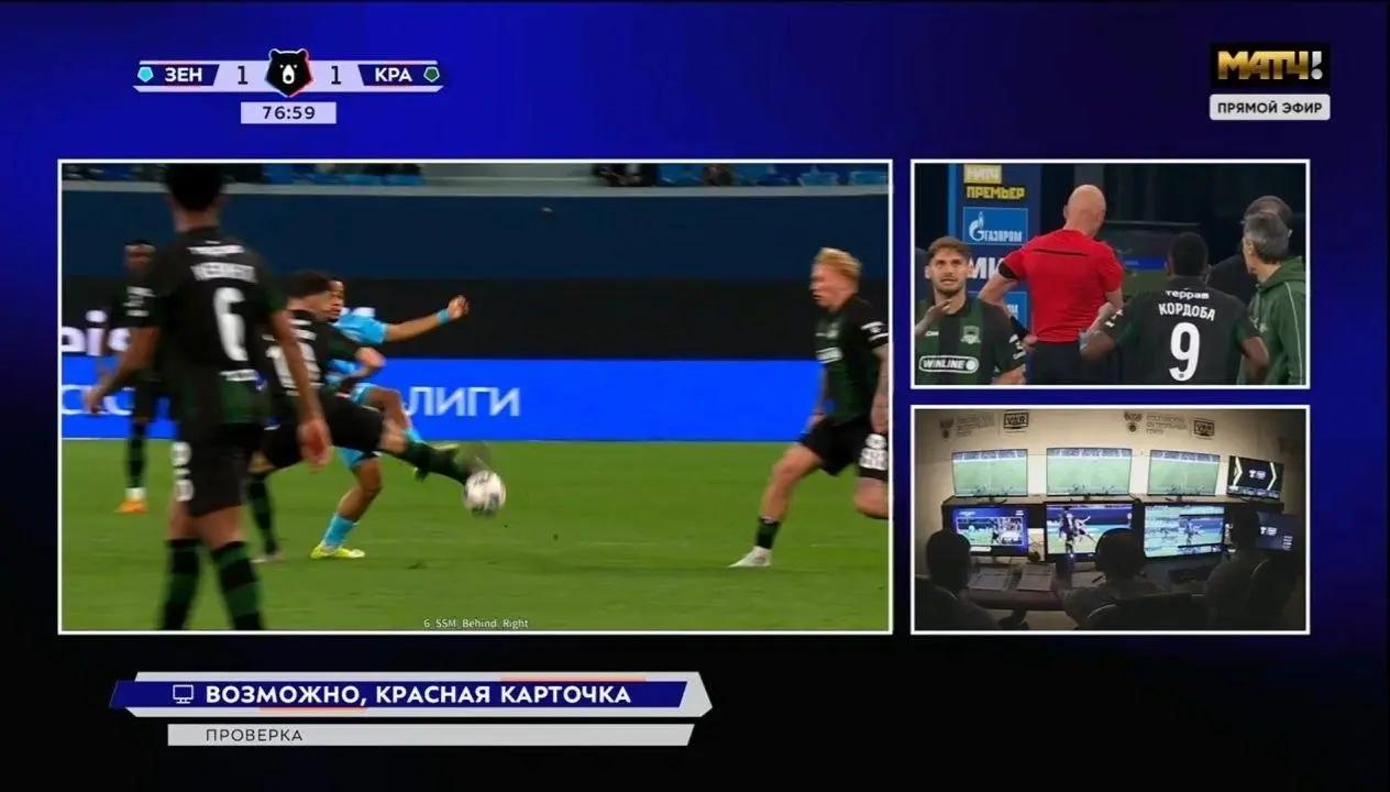 Арбитр удалил полузащитника Педро на 79-й минуте матча 24-го тура РПЛ против «Краснодара» после просмотра VAR.
