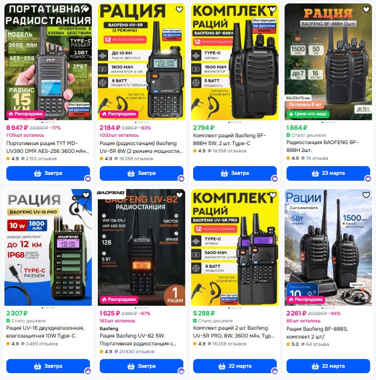 Рации на маркетплейсах в среднем стоят от 2 до 8 тысяч рублей, однако заявленный радиус связи в 10-12 километров в условиях города недостижим.